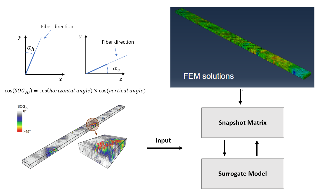 An overview of the problem description can be found in Figure 1. The dataset of fiber angles for European beech boards measured by multi-sensor scanners [1] and their FEM solutions for a tension experiment were made available by the professorship of wood technology (TUM). The resulting stress fields of FEM analysis are collected in a single large dimensional matrix called snapshot-matrix. Then, the snapshot-matrix is compressed into a smaller system via the singular value decomposition (SVD). The information of the fiber angle distribution are used as input for the training of a simplified model (surrogate model).